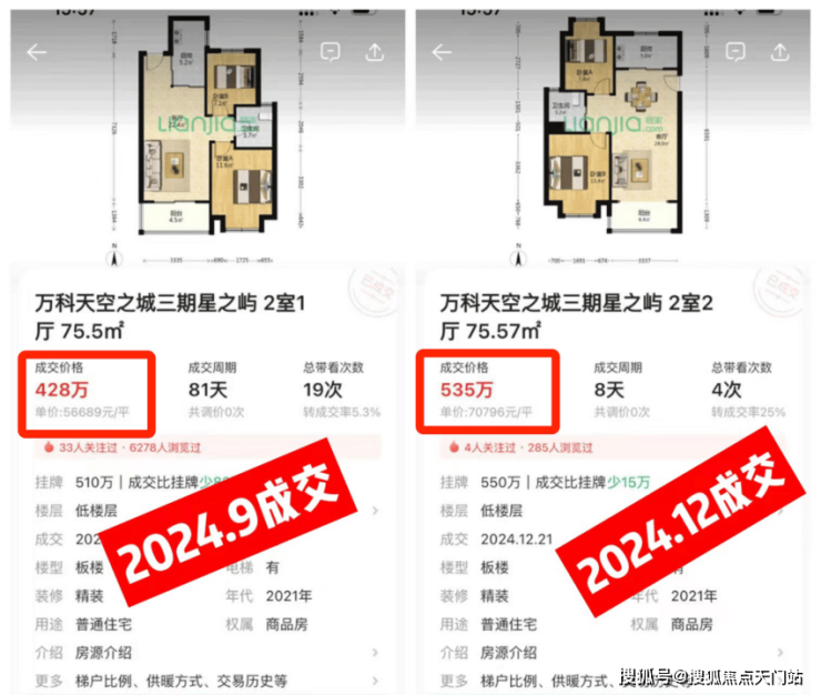 知名标杆二手,万科天空之城3个月猛涨107w,同样的户型面积,单价拉回了7万/㎡,且成交周期更短。
