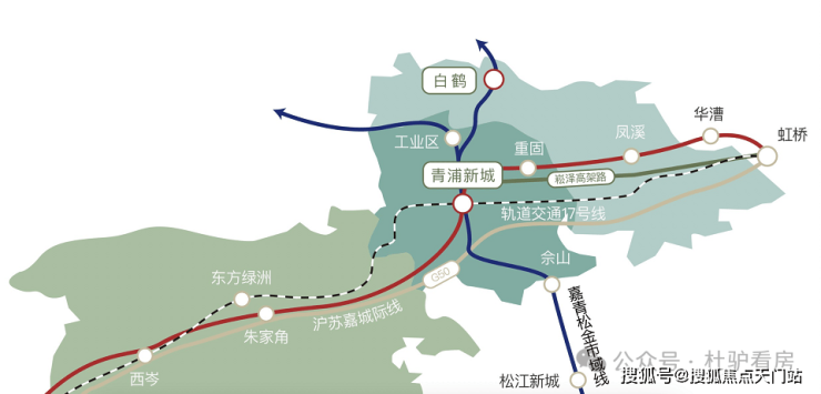 市域铁路:未来市域铁路嘉青松金线,将贯穿嘉定、青浦、松江和金山,届时白鹤将与青浦新城直接连通,并换乘轨交17号线和沪苏嘉城际线。