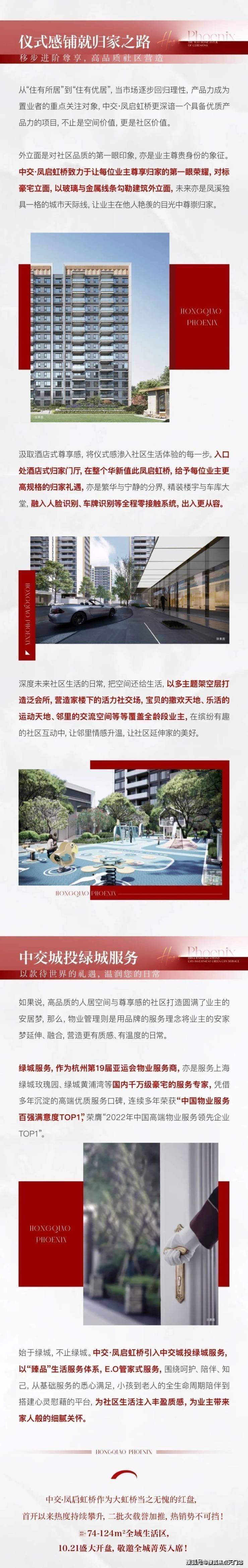在业主的归家动线上 售楼处电话:400-1182-105,中交·凤启虹桥打造了一条集礼序与智慧于一体的归家动线: 社区入口、楼宇入户、车库入户三重精装大堂,人脸识别、车牌识别等智慧科技,打造全程零接触归家系统,此外,引入 中交绿城服务,24小时全维度贴心服务,尊享高品质生活礼遇。