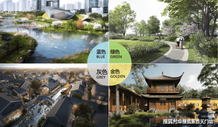 水城联动活力河塘,水陆相生,蓝色的水巷、绿色的田野、灰色的中式建筑、金色的麦浪凸显凤溪和而不同的特色空间场景;