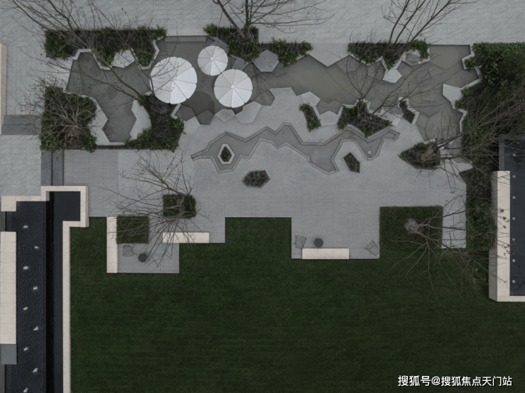 步入社区,首入眼帘的是约 6米高水幕的下沉式山水庭院,与周围建筑融为一体,将自然与松弛感带给社区。