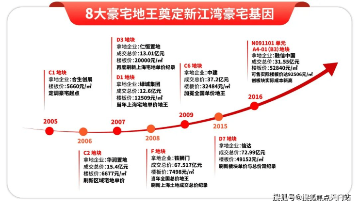 自2005年区域土地市场启动以来,新江湾城便拉开了“地王”迭出的序幕,十年间诞生了八个地王项目,总价与单价纪录不断被刷新,深刻镌刻了板块不可撼动的高端地位。