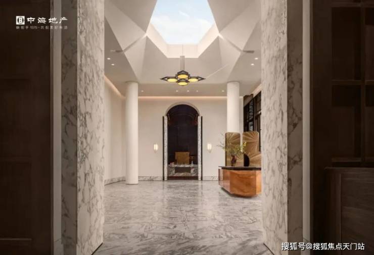 进入大堂,抬眼可见的是由一块完整的 巨型玻璃 组成的天窗,约7.9米高的钻石切面整玻吊顶+约500余块大花白奢石铺就的地面,让人每一次走进来都能感受到自然光线的包围,仪式感十足!