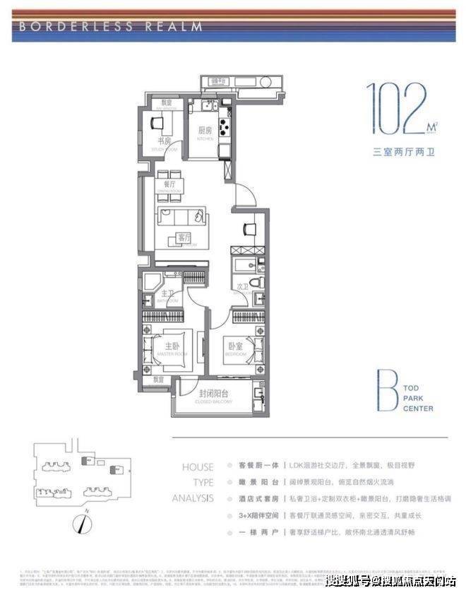 建面约102m²户型特点:LDK洄游式景观边厅,景致拉满,3+X陪伴空间,承载更多自定义功能需求,开放式厨房,烹饪与客餐厅无界互动。