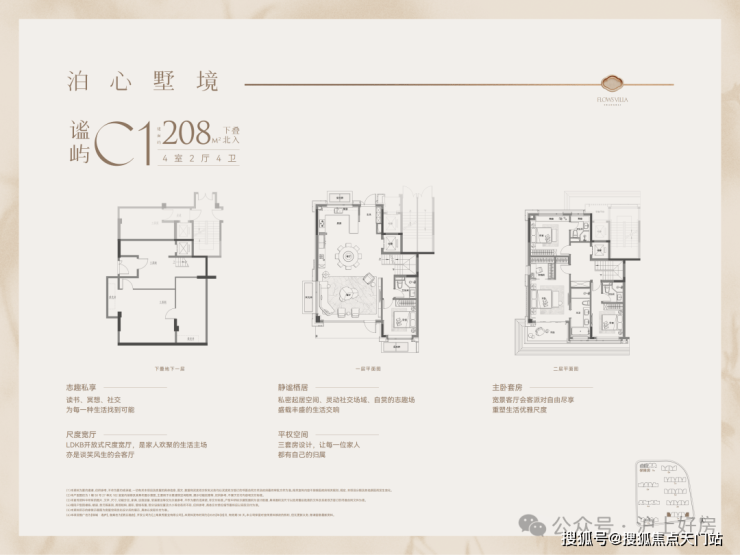 下叠户型,一楼南向大横厅约9.3米的南向面宽,配合约3.3米的层高,营造出开阔的空间感;