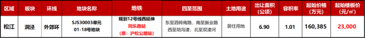 该地块位于松江洞泾镇, 容积率仅1.01。占地面积约6.9万方,总建面约6.97万方,限高24米。地块西北两侧水系环绕,景观资源非常丰富。据悉,该地块将是整个洞泾镇东部的最后一块低密度别墅用地。