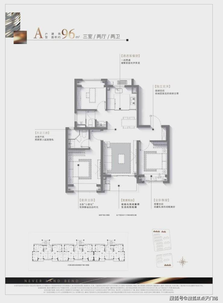 如 建面约96㎡户型,性价比极高,是一个低总价上车3房的优质选择。 经典飞机户型+三房两厅两卫设计,照顾家人的起居隐私;更有 客餐厨一体化贯通设计,使得空间不设限更显大; 主卧“小家化”,悦享静谧自由生活;进门处设置 独立玄关空间,增加收纳的同时,也保护了业主隐私。