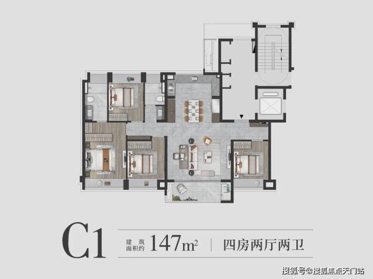 约147㎡4房在户型设计上,不仅做到了四开间朝南,更做到了三房朝南;同时客餐厅+厨房+阳台一线相连,是一个非常标准的南北通透户型, 室内的采光以及通风都非常出色,非常适合追求终极改善的购房者。