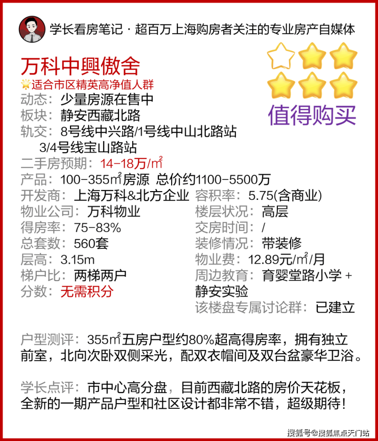 静安西藏北路「万科中興傲舍」在售中!约100-355㎡房源!总价约1100-5500万!