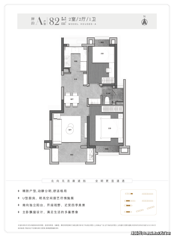 建面约82㎡两房,南向开间约6.3米,除了宽敞的主次卧,还做了全明的三段式分离卫浴。