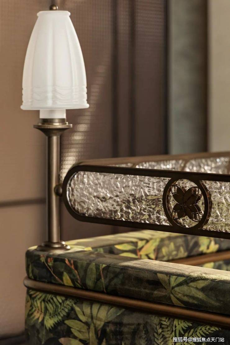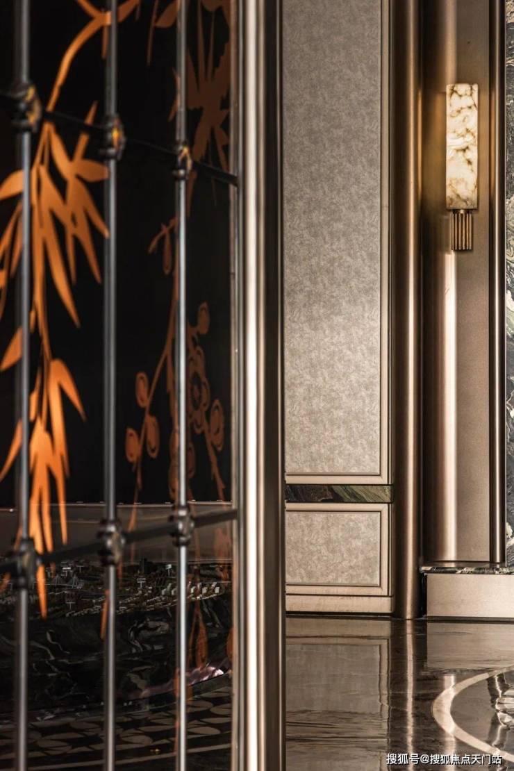 移步接待区,宛如步入精心布置的庭院会客厅。光影透过艺术玻璃,筛落一地斑驳,似竹影摇曳,又似几何光影的精密排布。空间的聚焦,是向下垂落艺术楼梯与屋顶繁华的关联之处,楼梯不仅是连接垂直维度的纽带,更是一件流动的雕塑艺术品。