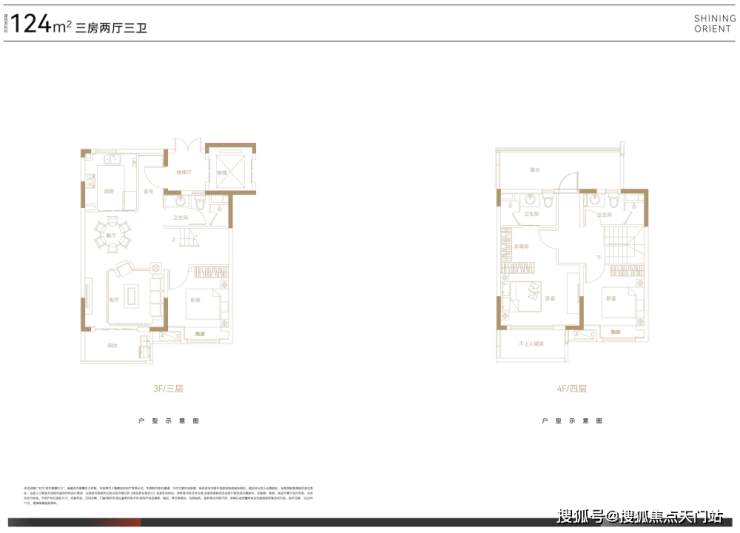 叠墅总高四层,设计了邻里空间,单元门设计也是非常的大气。上叠125㎡三房两厅三卫,顶楼闷顶层等可以拓展空间;下叠140㎡四房两厅三卫,另有超宽裕的赠送面积。
