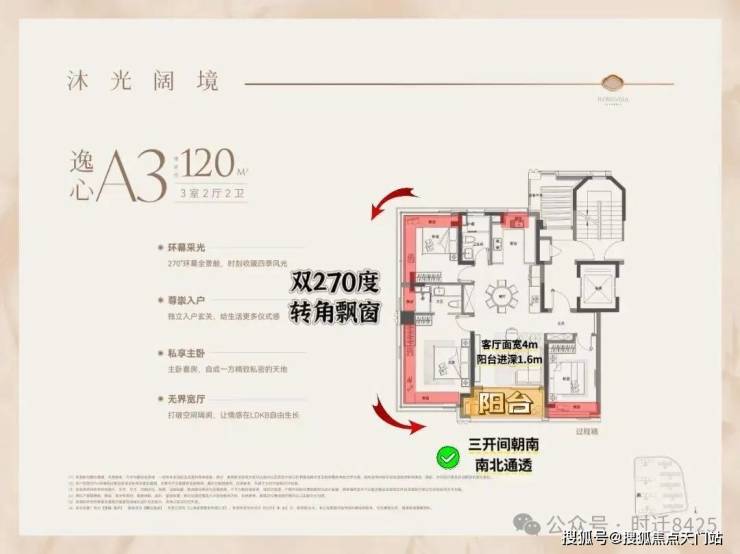 部分楼栋的120㎡户型做了类一梯一户的电梯厅设计。 三开间朝南 + 南北通透 + 飞机户型, 空间奢阔大气,是非常标准的一个改善户型。