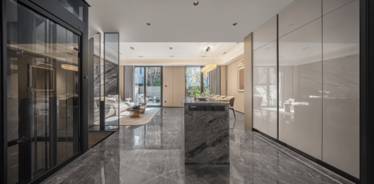 汽车坡道采用氛围照明,搭配星空顶造型彰显独特。玄关空间以线条灯光、地面环氧磨石、星空顶及柱面石材等,提升业主归家仪式感及空间品质感。