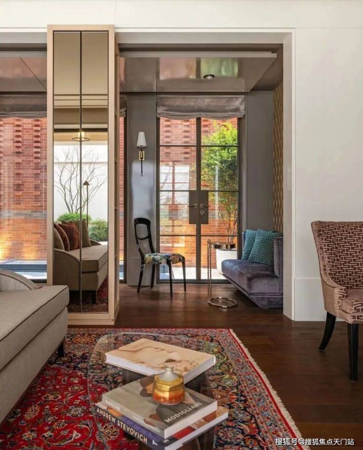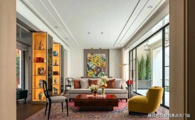 在客厅中,两个展示架巧妙地将空间分隔成主客厅区和休闲室,营造出一个与建筑尺度交相辉映的层次空间。