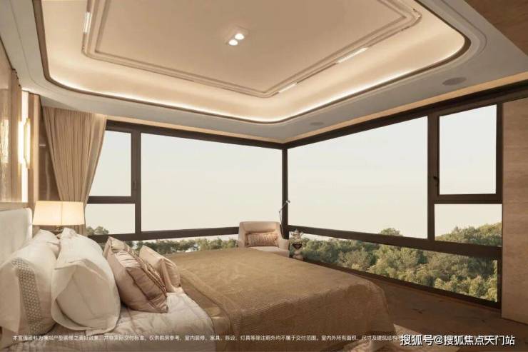 南、北、西三面除承重墙外均采用全玻璃幕墙设计,最大化引入自然采光与通风,站在室内即可感受无遮挡的开阔视野。南北两间卧室 配备270°全景天窗,搭配南向双阳台,让奢居属性进一步强化;