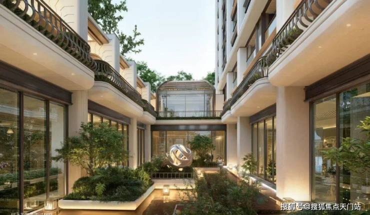 穿过社区大堂,是一片绿意盎然的下沉庭院,围绕下沉庭院设置一步观景露台, 将花园生活引入私密领域 ,营造出静谧的围合感!