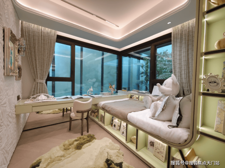 不仅是主卧,北向次卧同样配备了270°转角大飘窗。 “双270°”的设计 ,结合楼王的无遮挡视野,让无论是清晨的江景,还是黄昏的陆家嘴天际线,都成为日常起居的背景。
