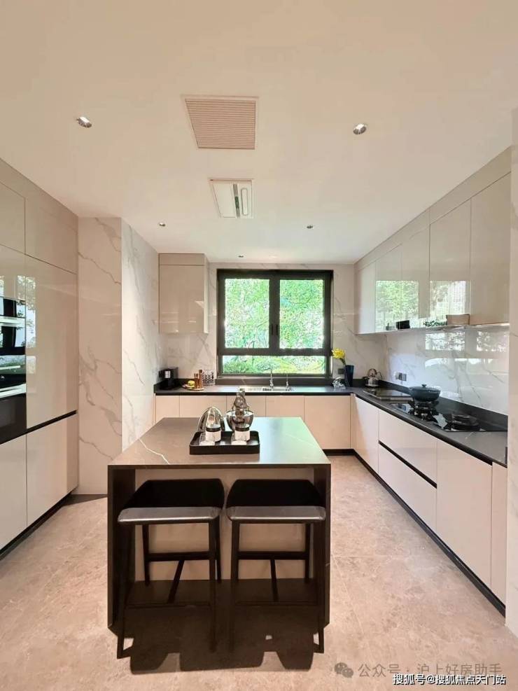 厨房玻璃门是 上轨道移门,意味着地面部分没有任何轨道,不会有灰尘积攒,炒菜时关上,避免油烟散入室内;平时拉开,可以扩充室内视觉感受。