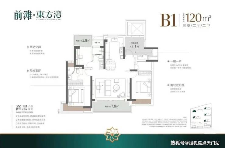 120平3房2卫主打改善进阶,总价在千万级别,采用全1梯1户设计,每个客户可以享受约6.7平独立电梯厅。
