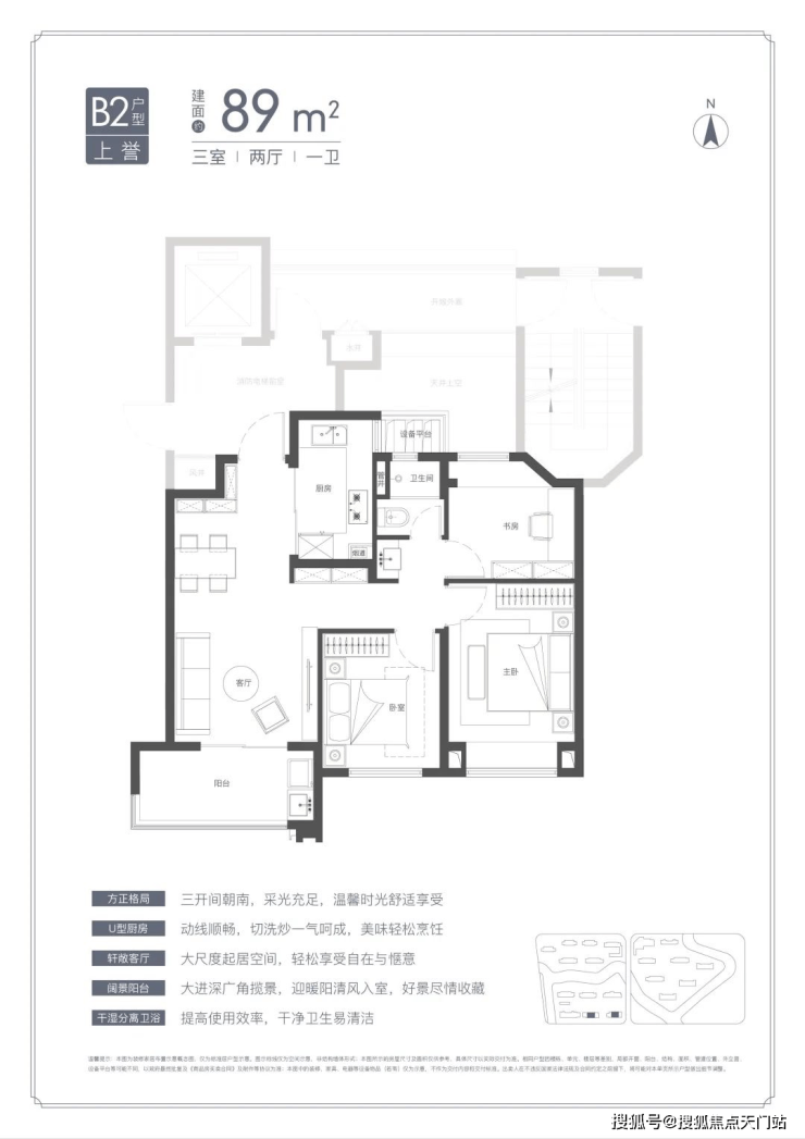 U型厨房、餐厅、客厅、阳台一线联通,南北通透。主卧套房、全卧飘窗、次卫干湿分离也都是标配。