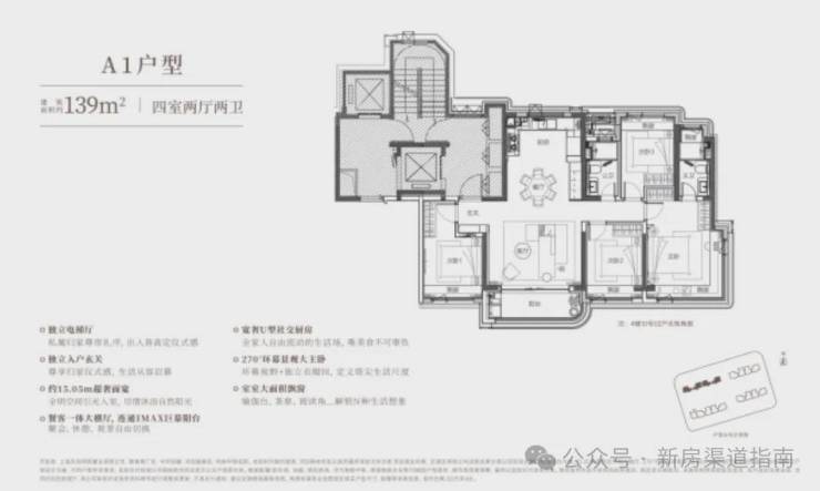 4#楼户型为建面约139㎡四房,拥有“个性大四房+15.05米IMAX大面宽+一梯一户(边套)+270°转角飘窗”构建纯粹改善设计。4#楼楼下的活力社交场, 有氧健身、瑜伽室、品茶区、日落咖啡吧等功能空间。日落咖啡吧采用 24小时开放模式,无论回家多晚,都有一盏灯为业主而留。