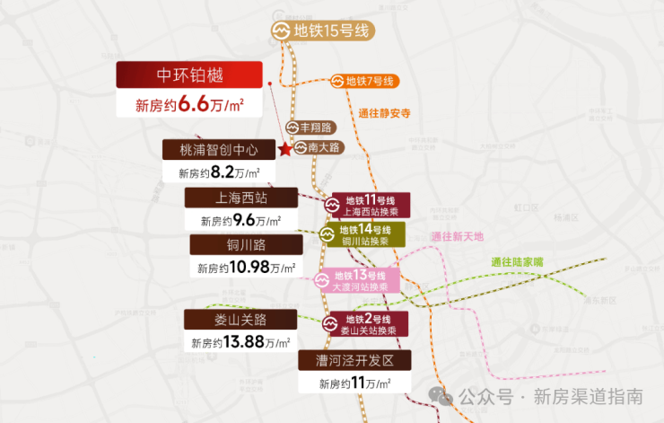 中环铂樾坐拥15号线南大路站(直线约300米),真正实现“地铁到家”的便捷生活。从这里出发, 4站畅达上海西站(新房均价9万+/㎡)、5站轻松抵达铜川路(新房均价10万+/㎡)、9站直达娄山关路(新房均价13万+/㎡),轻松串联城市核心板块。此外,15号线更可快速换乘2/7/11/13/14号线,无缝衔接大宁、虹口、陆家嘴等繁华商圈,商务出行、休闲娱乐皆高效无忧。
