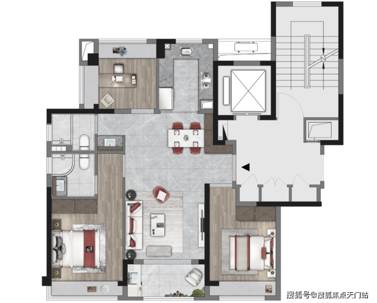 中间的台阶,三层递进,拾级而上,寓意“步步高升”,通过台阶错位的设计丰富归家的礼序,让整个建筑更富有尊贵感。