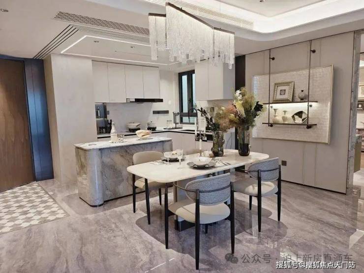 其一,半开放式厨房,结合客餐厅阳台一体化设计,当你站在厨房,视线无遮挡直接触达阳台,甚至直抵外面景观。