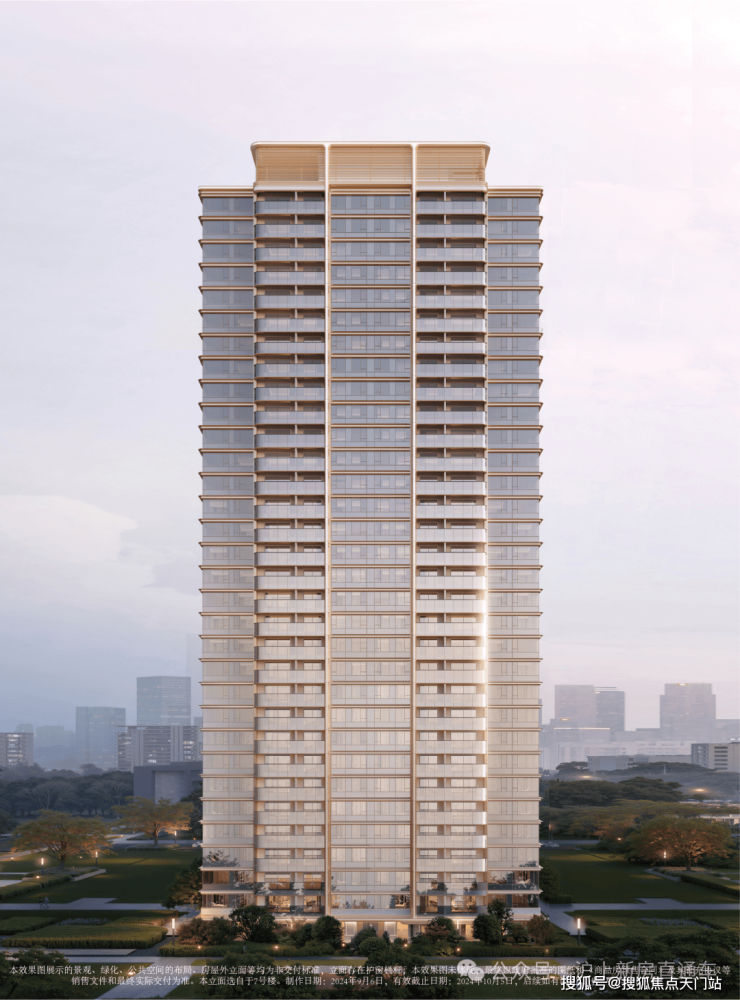 建筑方面,海上·清和玺采用独特的香槟金色格栅塔冠及壁柱,以香槟金与白色调搭配,形成“金镶玉”的立面造型,充分以“玺系”的品质结合在地文化海派以及人群品质需求。大面积的玻璃与精致的层间金属飘板相结合,营造出公建化的立面视觉效果,既保证了通透性,温润雅致且历久弥新。