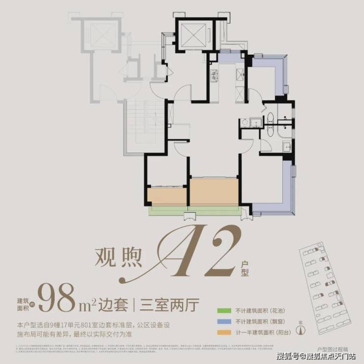 约98㎡3房:类一梯一户、全屋飘窗为标配,双阳台+花池是核心亮点(市面双阳台户型起步多为约110㎡),整体附赠约23㎡,是罕见的高实得率精致户型。