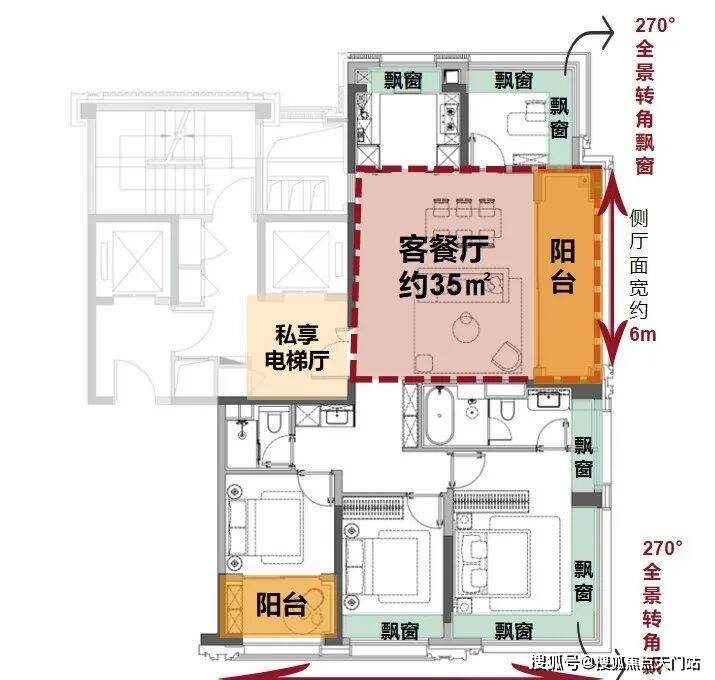 户型设计全屋飘窗与大尺度阳台,采光度全面提升,空间感倍增! 全屋赠送飘窗面积约12㎡ (不计容) 可自主改造,阳台总面积约14㎡ (一半计容) 搭配约7㎡的入户私厅,户型实得率超高!