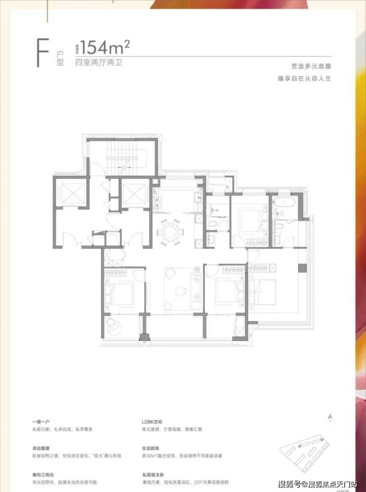 这个户型南向面宽约10米,设计上不走寻常路,打造环岛式侧厅,侧厅面宽近6米,联动同面宽多变阳台,形成约35㎡的开放式社交核心场域!