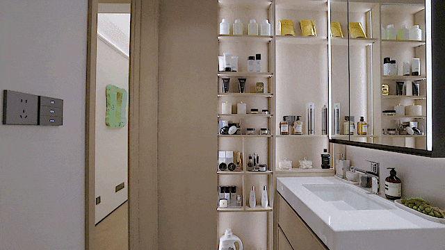 在这套样板间里,笔者看到了卫生间墙体的创新设计。 S墙增加了额外的收纳空间 , 一边可以有条不紊地存放各类瓶瓶罐罐,一边可以打造成衣物挂钩区,放置睡衣睡袍、毛巾等用品。