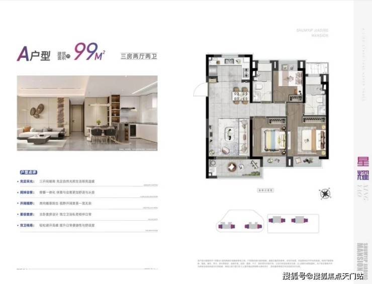 深嘉上府以88-99㎡的明星爆款小户型,圆年轻人的置业梦想。其中,88㎡户型以三房两厅一卫的格局,兼具功能性与尺度感。南向三开间,做到两间卧室朝南,这样的面宽,媲美市面上100㎡户型的新房尺度。u字形的厨房,动线合理。餐厅空间,能够从容摆放一张四人大餐桌。全屋飘窗设计,将赠送空间拉满。
