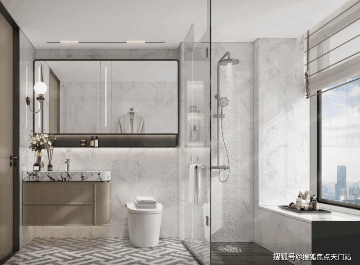 卫生间的收纳更是创新!双卫配置大容量镜柜并增设置物台提升实用性;公卫通体收纳柜,细枝末节的杂物均可一并容纳!