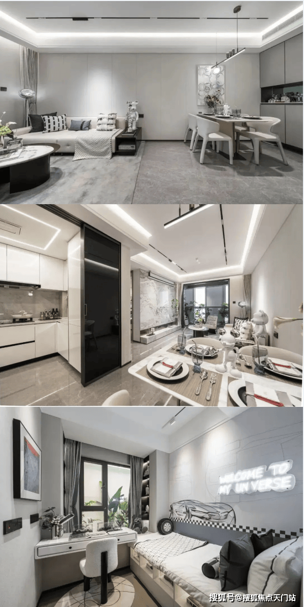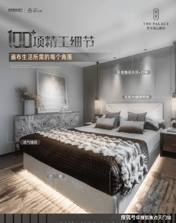 整体效果现代精致,十分符合当下年轻人的审美观;星级酒店式入户门,挑高约7米,宽约60米;石材金属线条背景墙加暖色系夜灯搭配,中庭花园水岛层叠、景墙错落,槭树青红间季节流转的温情脉脉展现,精致的水景让居住者仿若初入剧宴,感受剧目的艺术呈现……