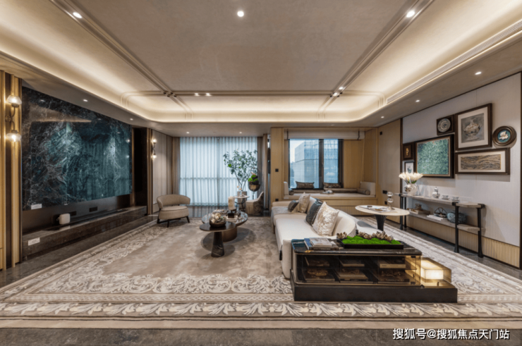 项目采用整块星空猫眼大理石打造的奢石背景墙,致敬荣宅的门头造型;并简化繁复的线条,勾勒出客厅纵横交错的浮雕勾线