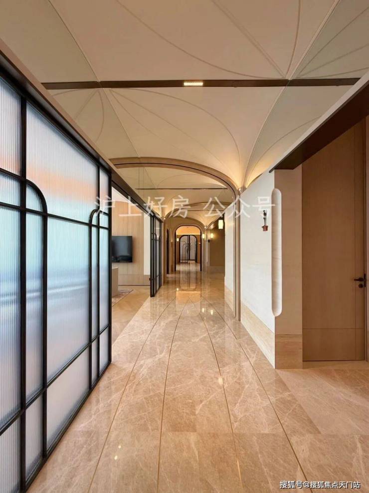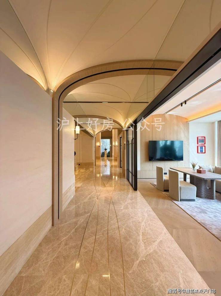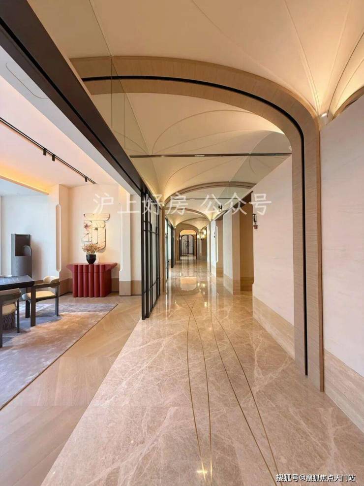 外滩瑞府的2号楼泛会所,正是华润置地深入洞察这份需求后,给出的精准回应。空间由汤臣一品、翠湖六期同款设计师渡边智昭先生操刀,实际呈现的质感不仅还原了设计师的蓝图,更带来超出预期的惊喜。整体空间中,艺术廊道深度融合外滩历史文脉,顶部石材切割出流畅的圆弧转角,与地面弧形线条相互呼应,行走其间宛如置身艺术展馆,每一步都藏着底蕴,这种经典设计语言让空间越住越耐看,经得起时间考验。