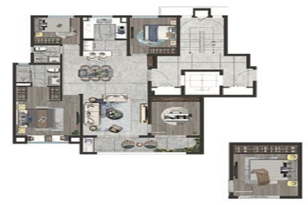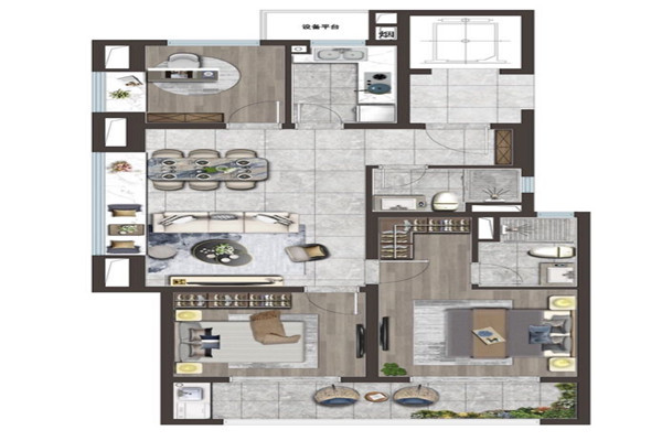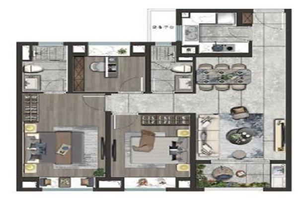 【107m2三房两厅两卫:南向双卧室配备奢阔尺度阳台,光线充足,次卧和书房可变空间,实现空间的自由切换和高利用率。】