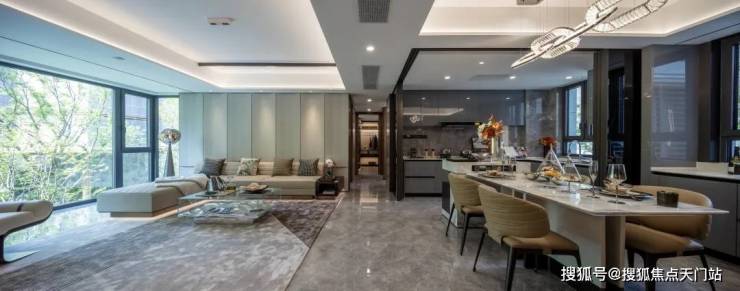 3、高端的爱马仕灰奢石打造的景墙,转角弧面犹如犹如翡翠赌石,优雅贵气。