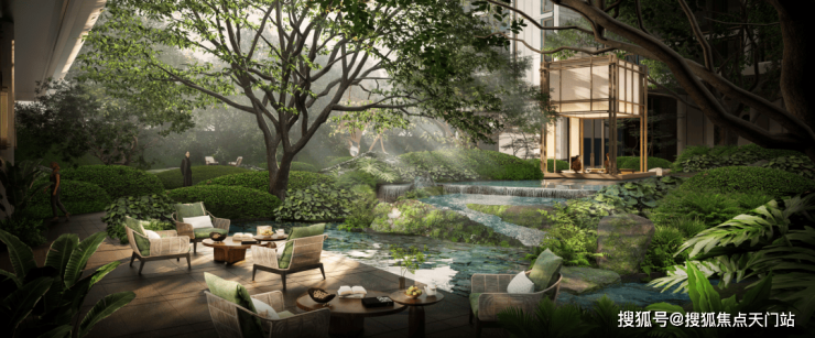 反复考量水景面积、叠水水深、水体吨数,精确计算出能耗比,最后将社区约300㎡的水景区域,科学划分为5个相互呼应的独立模块,并分别配备循环系统,结合业主每天的生活场景,规划不同模块水系开放时间。