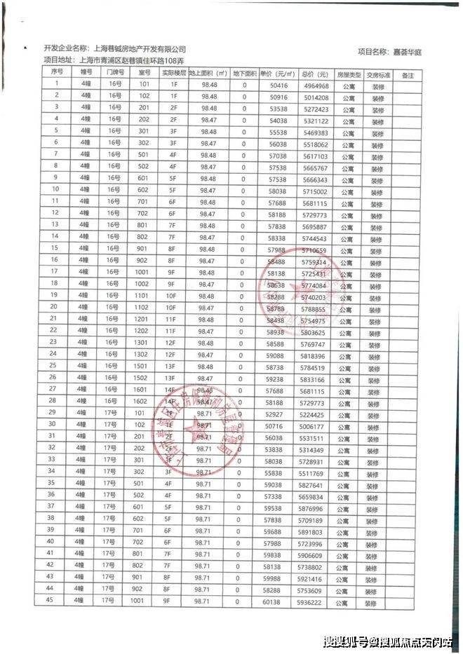 一房一价表如下