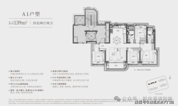 4#楼户型为建面约139㎡四房,拥有“个性大四房+15.05米IMAX大面宽+一梯一户(边套)+270°转角飘窗”构建纯粹改善设计。4#楼楼下的活力社交场, 有氧健身、瑜伽室、品茶区、日落咖啡吧等功能空间。日落咖啡吧采用 24小时开放模式,无论回家多晚,都有一盏灯为业主而留。