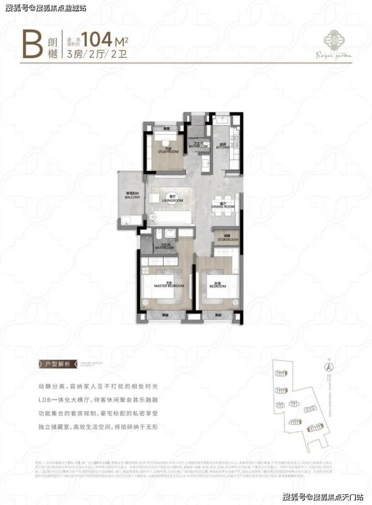 104㎡3户型特点:该户型多为楼栋的 东边套,是一个观景户型。客厅连接270°阳台,视野出众。双卧朝南,阳光满溢。从次卫布局看,如果家庭人口较少,该户型还能做成双套卧。