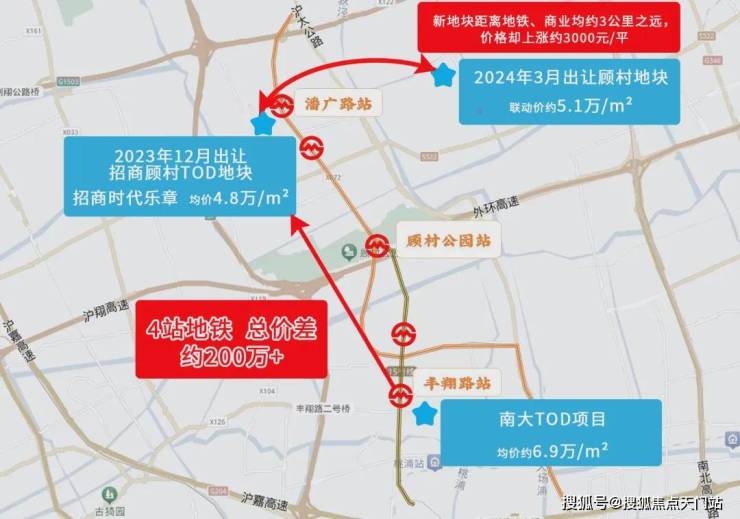 2024年一批次土拍中,顾村板块内新地块联动价格为5.1万/㎡,上调了3000元/㎡!而该地块距离地铁商业均在3KM左右!