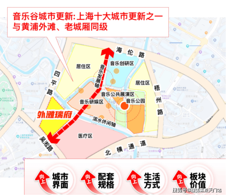 项目紧挨嘉兴01单元,正对上海音乐谷,未来将形成滨水艺术休闲区,规划新增8个小剧场、3个livehouse、1个水上剧场,把“夜上海”的流量重新拉回虹口。从外滩瑞府出发,穿过一座步行桥,就能抵达这个未来的世界级演艺群落。