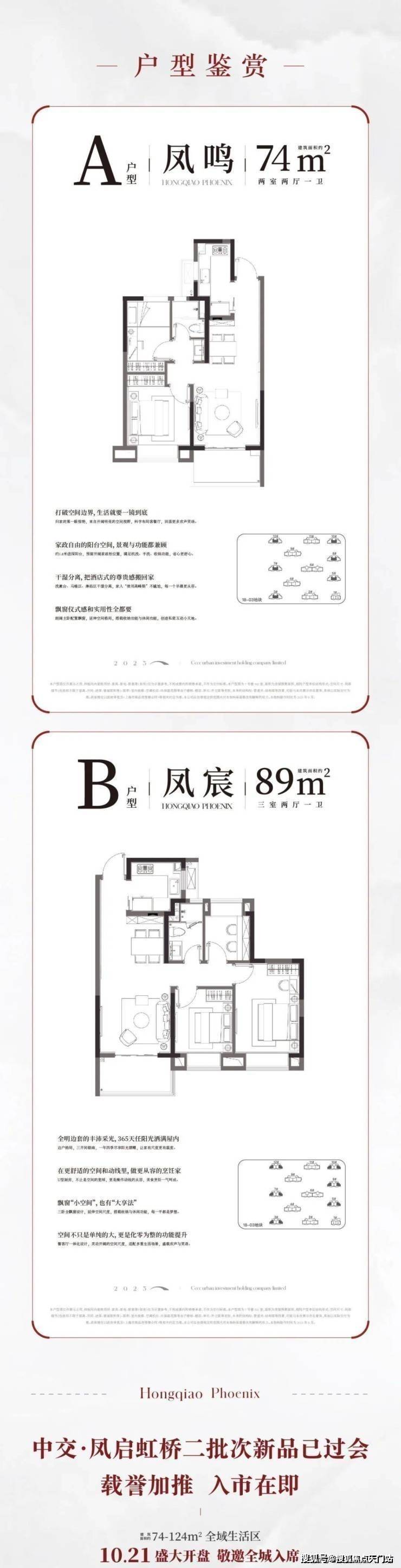 青浦重固全新盘20万方一站式全域未来生活区! 中交凤启虹桥二期认购!推出建面约74㎡两房、89㎡三房、99㎡三房、124㎡四房、127㎡四房,均为精装交付,备案均价为45700元/㎡, 总计283万起直接认购无需积分,一房一价表见文后。