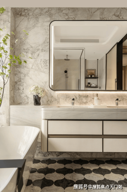 主卧套房设计,质感皮革背景墙围合出安稳的睡眠氛围,而步入其内的主卫,如世界奢华酒店设计,双台盆设计体贴共居的从容,南斯拉夫白、土耳其鱼肚灰与香奈儿灰星耀灰等奢石铺就,在灯光下交织出纯净而高级的质感。