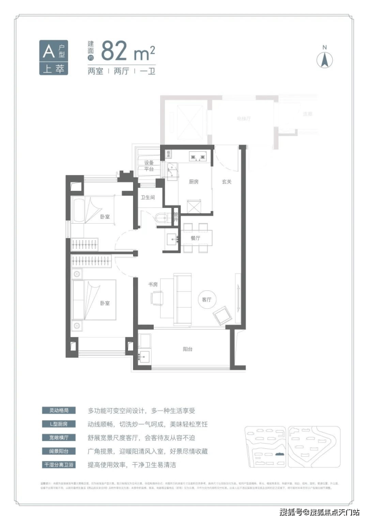 U型厨房、餐厅、客厅、阳台一线联通,南北通透。主卧套房、全卧飘窗、次卫干湿分离也都是标配。